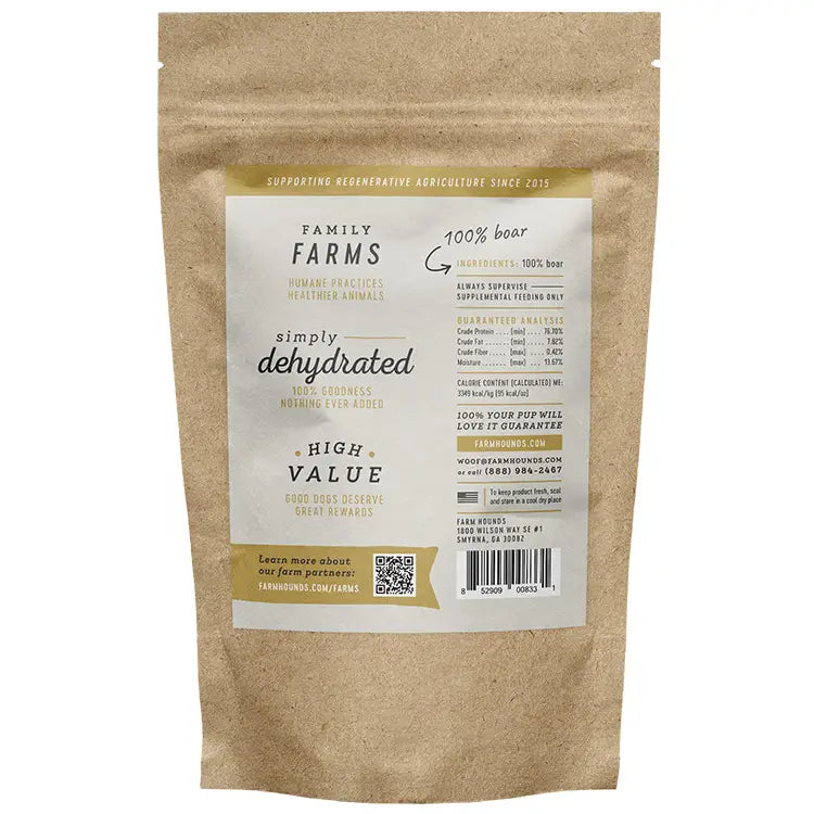 Every bag clearly shows the farm where the boar was sourced, so you always know exactly where your dog’s treats come from. Gently air-dried to preserve flavor and nutrition, these jerky strips are perfect for training, rewarding, or everyday snacking.